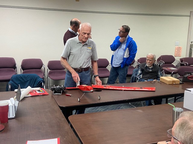 A great deal of business was conducted with everyone looking forward to doing more flying, building, and social activities very soon. Our meeting concluded with Jim Shiels demonstrating, during our 'Show and Tell' session, the setup on his scratch-built, balsa-wood and Monokote-covered 'Yardstick' monoplane he recently designed and constructed.
