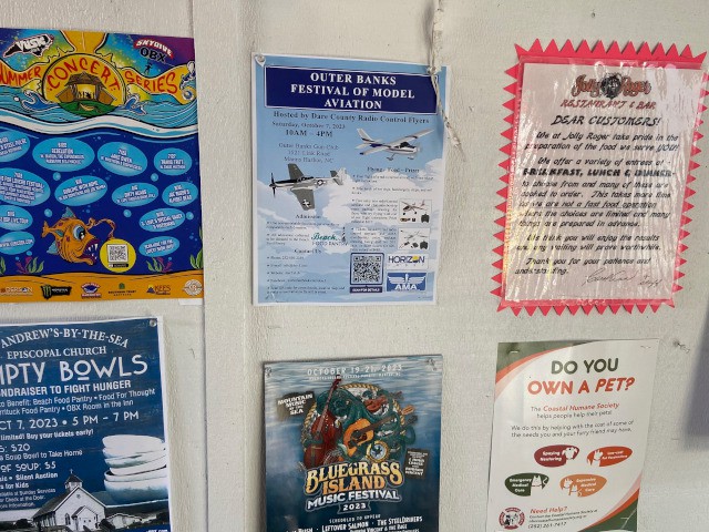 Five club members met today for breakfast and to do planning for the upcoming Outer Banks Festival of Model Aviation event at the Jolly Roger Restaurant. In addition, marketing materials for the event and the club were placed on display in the restaurant's lobby.