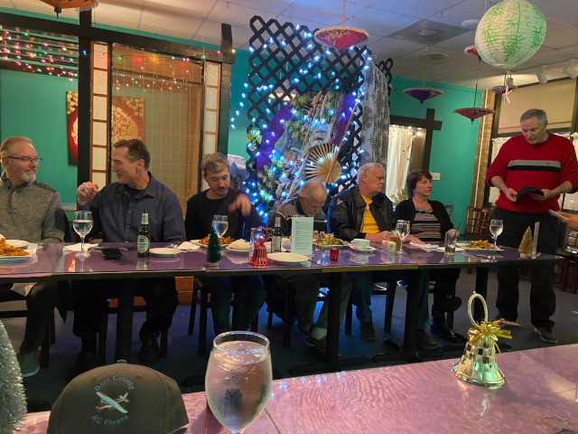 Nineteen of our club members and their dates attended our annual Christmas party at the Thai Room Restaurant in Kill Devil Hills. Club president, Jim Davis opened the event by briefly speaking about some significant events and accomplishments of the past year, and expressed his thanks to all for their hard work. Jim also announced that the club was recently designated as a Gold Leader Club by the Academy of Model Aeronautics, and club vice president, Robert Yanacek, presented Gold Leader Club pins to the members in attendance.