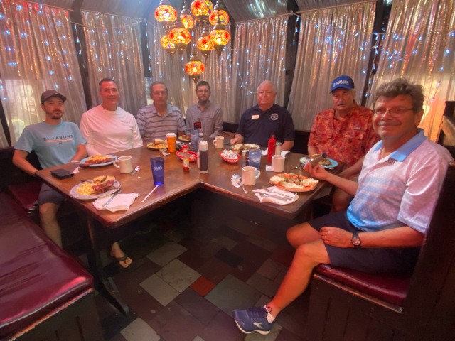 Philip Garey, Grant Dick, Robert Yanacek, Stephen Yanacek, Rusty Kennedy, Charlie Doss, and Jim Davis met for breakfast today at the Jolly Roger restaurant in Kill Devil Hills. Of special note is that one of our members, Rusty Kennedy, came down from Poquoson, Virginia to discuses his role at the Academy of Model Aeronautics, and as chairman at the Academy of Model Aeronautics Foundation.