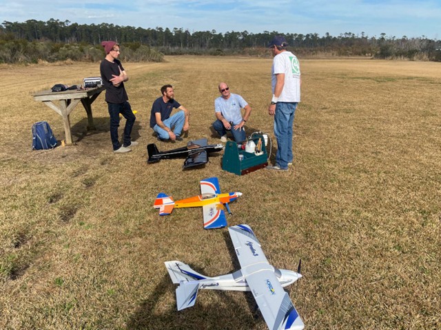 No flying today, but nonetheless Robert Yanacek, Stephen Yanacek, Peter Fynn, and Philip Garey got together for breakfast at the Jolly Roger Restaurant in Kill Devil Hills to talk about model planes and exchange ideas.