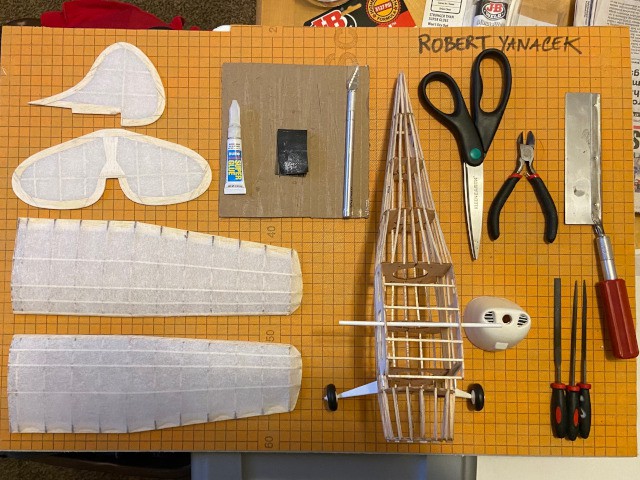 We completed our fourth and final build session this evening which began with a quick class by Peter Fynn on applying dope to the covered surfaces we completed this past week. Most had finished covering all their aircraft's surfaces with silkspan, and those that had not continued to work on building and covering to get caught up. We also installed our plane's rubber band motor after applying lubrication to it provided by Jim Shiels.