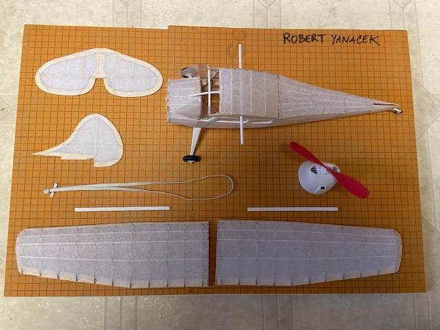 Following another week of continuing to build at home, participants met once again. With all the framing now completed, we received a quick class from Peter Fynn about the process of covering our models with silkspan. Using a diluted glue mixture, Jim Davis, Jim Shiels, Stephen Yanacek, Philip Garey, Robert Yanacek, Matt Cooke, and Kolton Cooke turned-to and began the covering process. Over the next hour and a half, we all completed covering the surfaces of the wings and empennage.