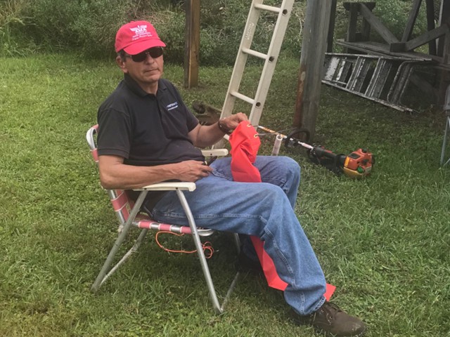 Our day began at 9AM with Robert and Steve cutting and trimming the grass on the field and surrounding areas. Both Jim Davis and Jim Shiels arrived about an hour and a half later and evaluated our building that is used to store our mowing equipment for repairs and improvements. Robert also installed a replacement windsock–a much needed repair.