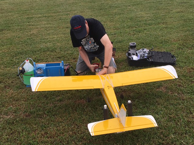 About noon, our members and guests were treated to a lunch of hot dogs and refreshments thanks to the efforts of Stephen and Peter Yanacek who manned the grill. Grant Dick then thrilled those attending with his superb skills piloting his electric-powered F4U-1D Corsair. His demonstration included low-level high speed passes, stalls, inverted flight and the usual aerobatic rolls and loops. Jim Davis also performed a number of parachute and candy drops with his nitro-powered Piper J-3 Cub to the pleasure of our younger guests. Our newest member, Stephen Yanacek, was also able to conduct a maiden flight with his HobbyZone AeroScout S under the supervision of flight instructor, Grant Dick. Jim Davis' flight with his B-25 Mitchell unfortunately was short-lived, due to the loss of an engine on takeoff, however the aircraft was recovered intact with only minor damage.