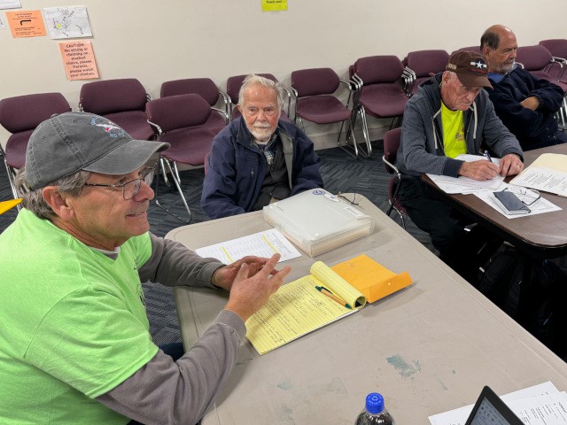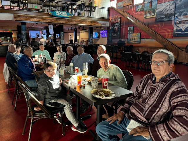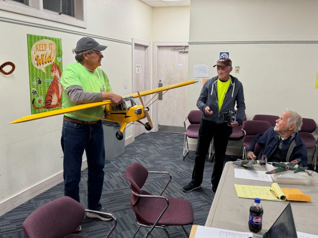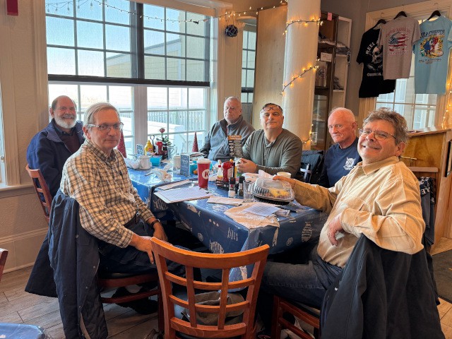 For the third weekend in a row, flying today was not possible due to very strong winds, so John Silva, Grant Dick, Peter Fynn, Diane Yanacek, Robert Yanacek, Skip Wescott, Charlie Doss, Rose Carros, and Pete Carros met for breakfast at the Jolly Roger Restaurant to discuss their recent projects and the upcoming club meeting on Thursday.