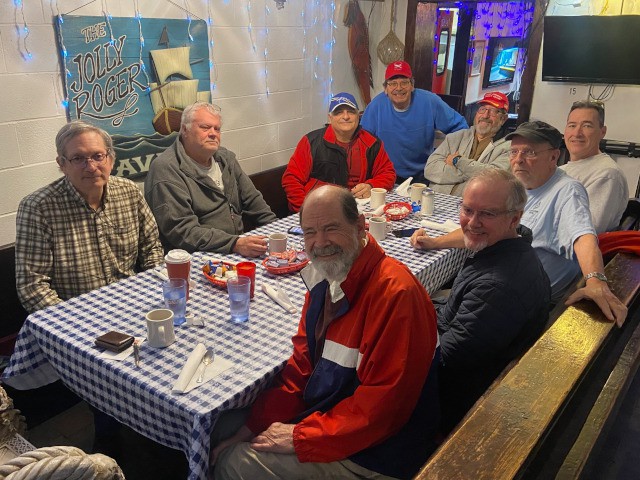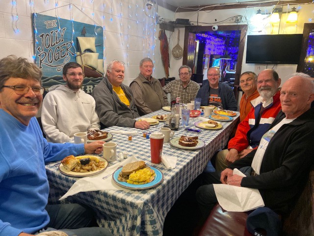 High wind gusts on the Outer Banks prevented flying today, however nine club members and one guest met instead for discussion about our club and model aviation over breakfast at the Jolly Roger Restaurant.