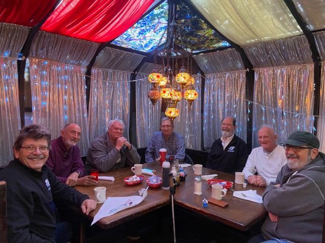 Jim Davis, Stephen Yanacek, Skip Wescott, Mike Alexander, Robert Yanacek, Mike Kirkpatrick, Pete Carros, Peter Fynn, and Jim Shiels met for breakfast today at the Jolly Roger Restaurant to discuss our recent projects and to decide whether the conditions were favorable for flying.